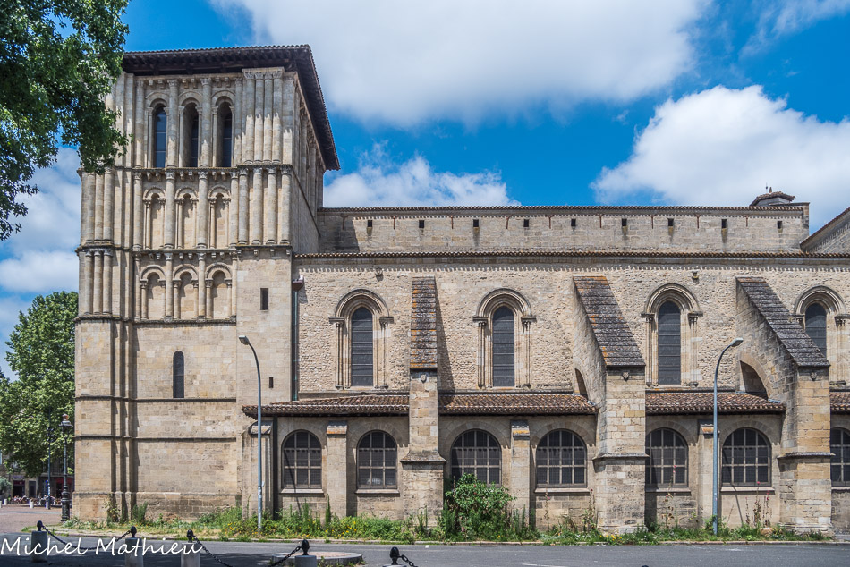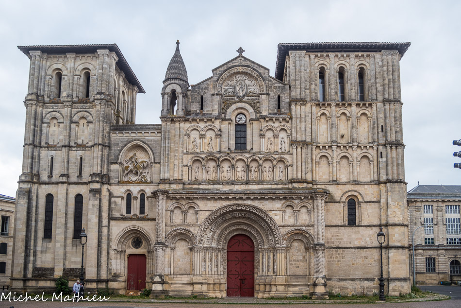 Bien que l'abbaye ait été fondée au VIIe siècle, l'église actuelle ne fut construite que vers la fin du XIe siècle et au début du XIIe siècle, avec une façade de style roman saintongeais. Le clocher à droite du portail remonte au 12e siècle, son porche au 11e tandis que le clocher de gauche a été rajouté au 19e siècle par l'architecte Paul Abadie.