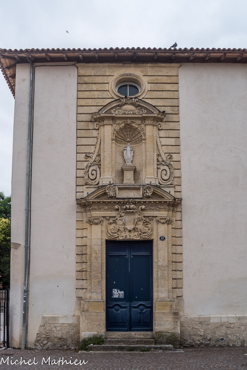 La façade, sans décor, est percée d’une baie flamboyante et d’un portail central