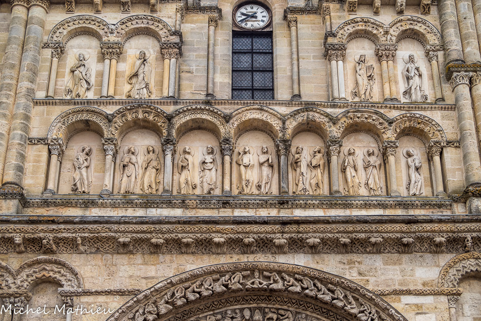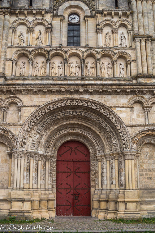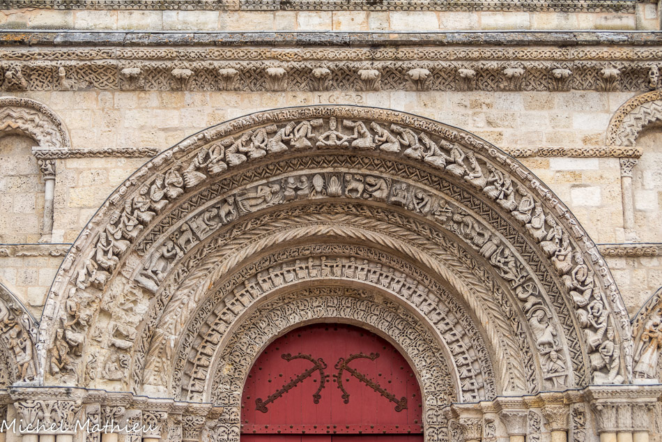L’iconographie des cinq voussures de la porte centrale traduit la force de l’église triomphante et militante que le fidèle de l’époque doit pouvoir aisément interpréter. Ainsi, la représentation d’hommes tirant sur une corde figurant sur la deuxième voussure, symbolise les efforts que l’âme doit faire pour atteindre le Paradis.