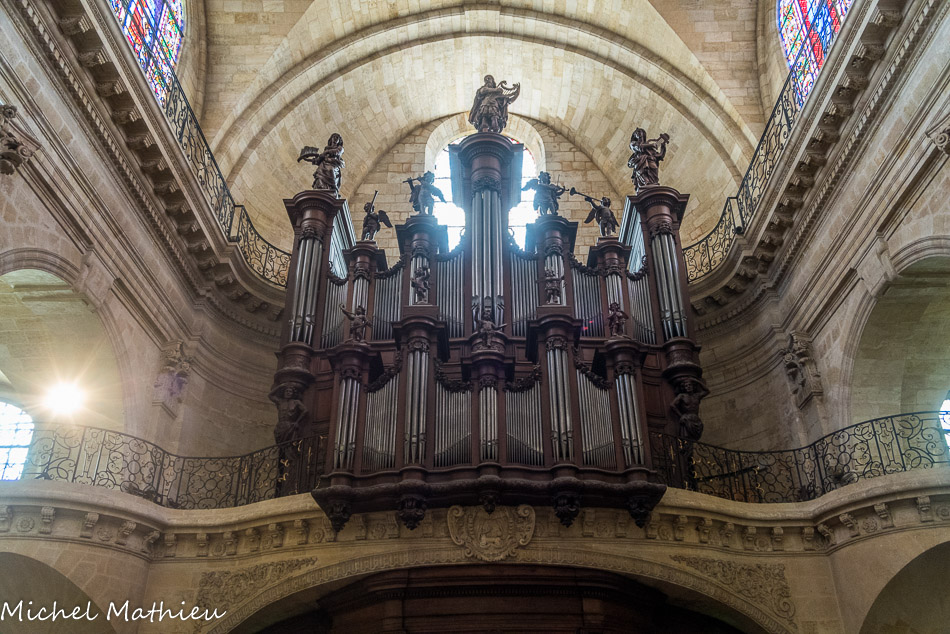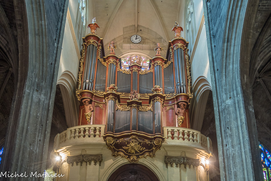Le buffet d'orgue, de style Louis XV, est construit de 1762 à 1765 par Cessy et Audebert. Les grandes-orgues, œuvres de l'organier Micot, ont été restaurées à plusieurs reprises, et notamment
