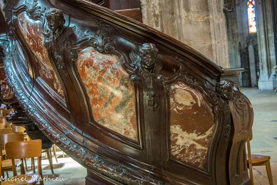 Dans la nef, une chaire de Feyneau (1753), alliant bois d'acajou et panneaux de marbre est surmontée d'une statue de Saint Michel, patron de l'église.