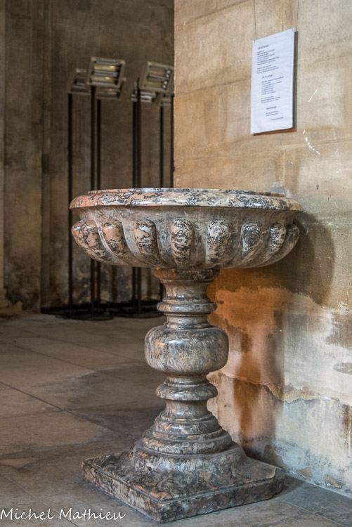 La cuve de style Directoire a été sculptée en 1792 par André Joseph Queva, artiste d'origine italienne. De forme ovale en marbre rouge incarnat, elle repose sur une demi-colonne centrale en marbre non poli et quatre pilastres corinthiens cannelés. Le contour de la vasque est orné d’oves.