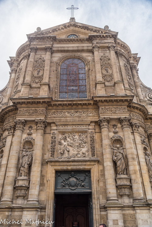 La façade de l’église, baroque, de style jésuite, sculptée par Pierre Berquin et ses fils Pierre et Jean vers 1693, représente notamment la Vierge donnant le Rosaire à Saint Dominique. L’avant-corps de deux étages s’incurve pour se rattacher aux parties latérales, plus basses. Des colonnes alternent avec des pilastres, créant un mouvement ascensionnel, une longue corniche, soulignée par une frise très décorée, unit tout l’ensemble. De chaque côté de la façade, quatre splendides statues blotties entre de larges piliers accueillent les visiteurs.