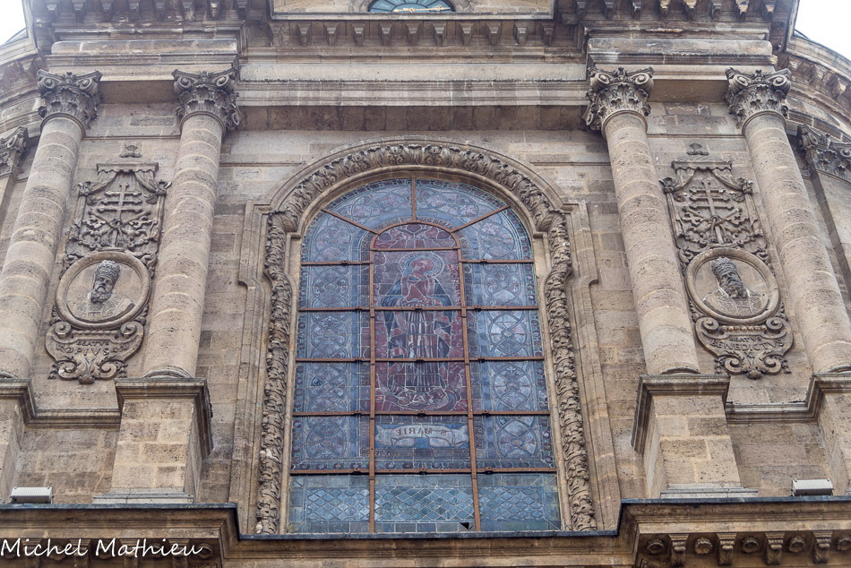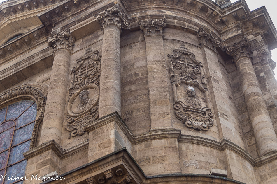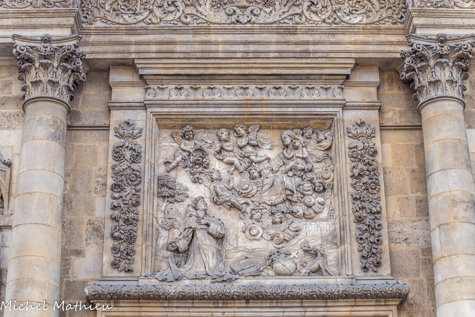 On peut également remarquer de très belles moulures sculptées à même la façade. Au-dessus, dans les médaillons, figurent quatre papes de l’Ordre Dominicain. Quatre grandes statues de grands docteurs de l'Église Latine, datant de 1865, leur répondent : saint Ambroise, saint Grégoire, saint Jérôme et saint Augustin et sont l'oeuvre d'Edmont Prévot en 1866.