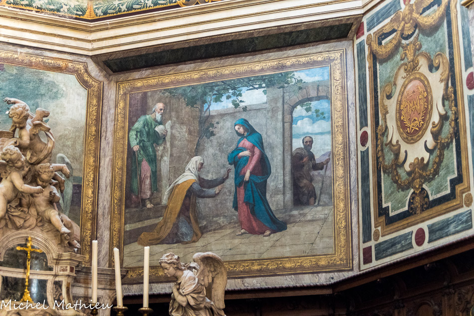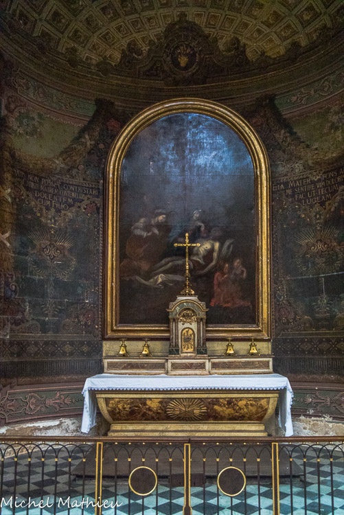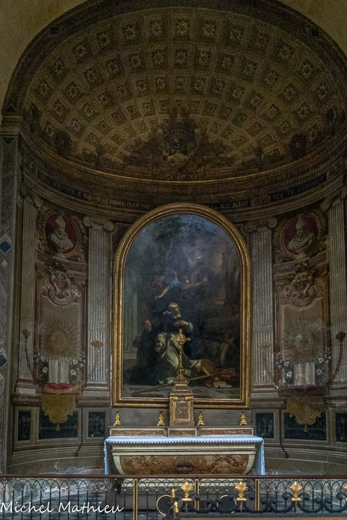 Tableau signé Frère André, 1733. Cette scène rappelle la vision prophétique qui fut donnée au Pape Pie V lors d’une nuit c’octobre 1571 à la veille de la bataille de Lépante. A cet instant quittant les cardinaux qui l’entouraient, il redoubla la ferveur de ses prières pour implorait les secours du Ciel et revenant il annonça la victoire de Juan d’Autriche sur les Turcs qui sauvera la chrétienté.