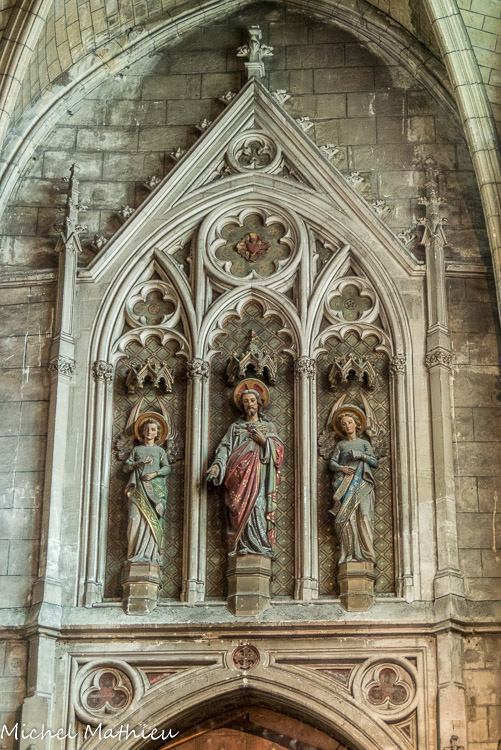 datant du début du XVe siècle. De forme ogivale, ce portail est un bel exemple du gothique flamboyant. Il présente trois rangs de voussures dont deux ornées d’anges, de prophètes et d’apôtres. La disparition du tympan, de la sculpture du pied-droit et des statues des niches latérales ne permet malheureusement pas de reconnaître le programme iconographique. Lors de la restauration de Jules Mondet, le sculpteur ornemaniste Jean Mora refait les chapiteaux, les pinacles, les fleurons, les gargouilles