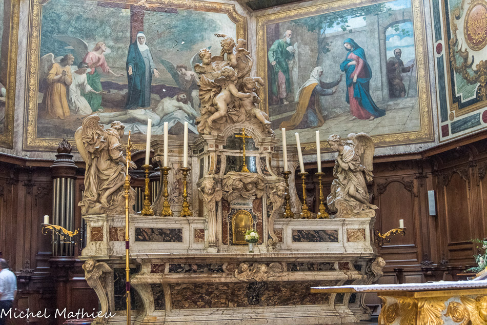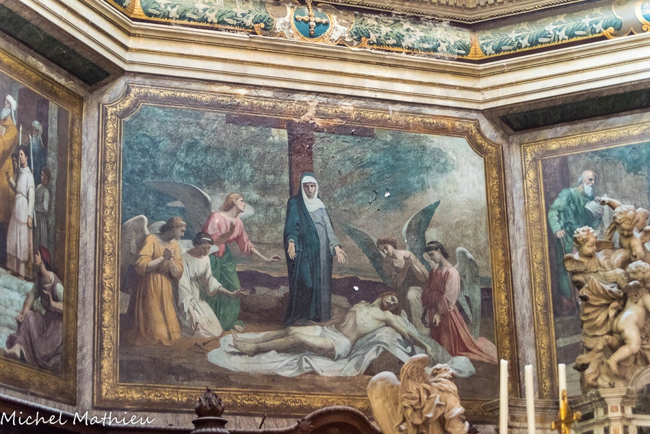 Catherine de Sienne (1347-1380) fut partagée sa vie durant, entre la soif de contempler le Christ en croix et le service de l'Eglise que déclaraient les factions. Le tableau est signé : F. André Pinxit, 1716.