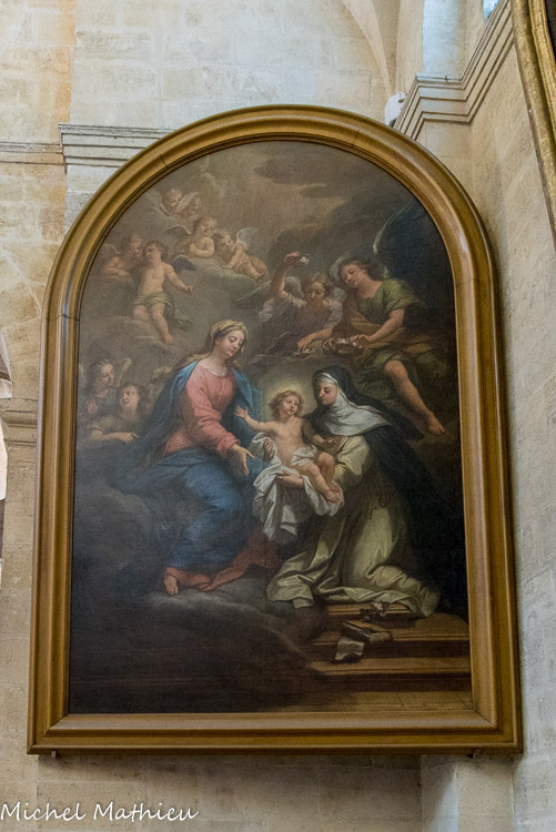 Sainte Thérèse est à la droite de la Vierge Marie. Un portique formé de colonnes antiques symbolise l'entrée du Paradis. De chaque côté, des vases évoquent les litanies reconnaissant Marie "vase insigne de dévotion". Dans les bras de sa mère, l'Enfant-Jésus cueille des roses et les fait tomber sur terre par l'intermédiaire de la sainte carmélite. Quatre enfants ornent les côtés du tableau. Le premier à gauche (le neveu de l'artiste) porte la maquette de l'église Notre-Dame tandis que celui de droite tient les armoiries de Mgr Andrieu, alors Cardinal-Archevêque de Bordeaux.