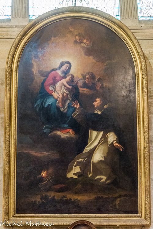 Ce tableau évoque l'apparition de la Vierge Marie à Albi en 1210. Dans la ferveur de ses prières Saint Dominique a vu la Vierge Marie lui remettre un rosaire et les Dominicains se sont depuis attachés à propager cette dévotion dans le monde.