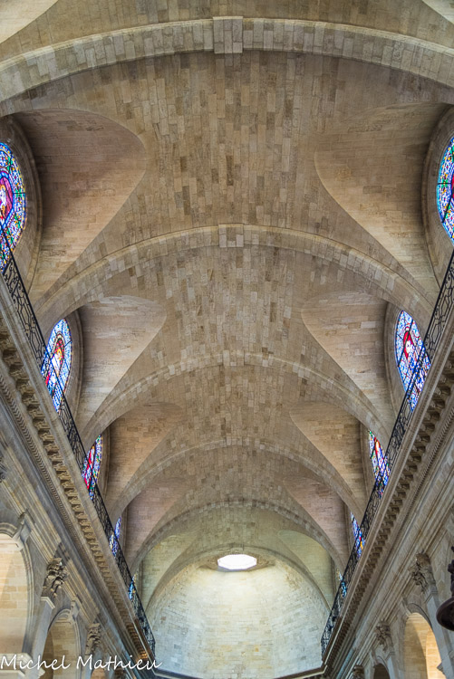 Les voûtes en ogive sont supportées par douze piliers que séparent des arcades à plein cintre.