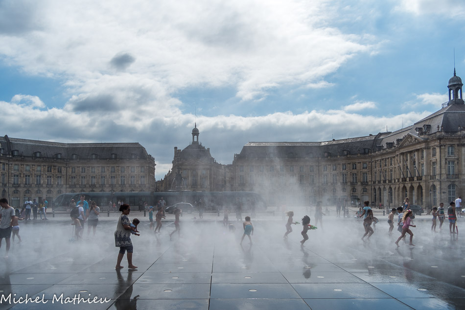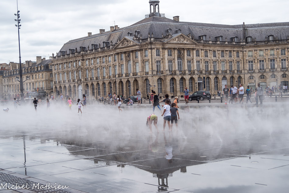 Sous cette dalle se cache un astucieux mécanisme qui permet d'alimenter en eau l'ensemble, avec plusieurs effets différents, et sur un cycle bien précis piloté par ordinateur. Le pavage est ainsi recouvert de 2 centimètres d'eau qui transforment la dalle en un immense miroir dans lequel la place de la Bourse se reflète.