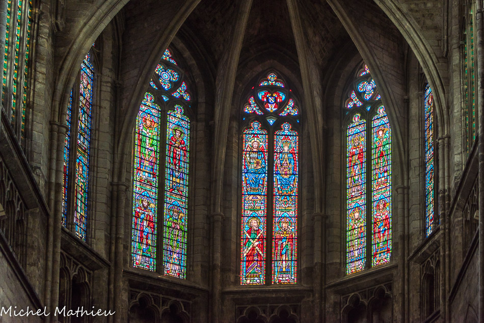 Les vitraux du XIXe siècle de Joseph Villiet représentent des scènes de la vie du Christ, de la Vierge et Saint Joseph avec des figures de l'ancien testament. En haut, la Crucifixion. Au-dessus des personnages : la Cène, le Chemin de Croixn, la Déposition, la Mise au tombeau.