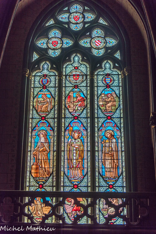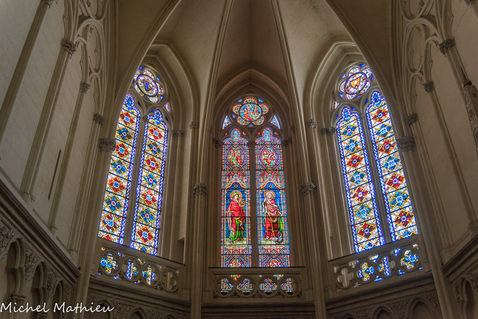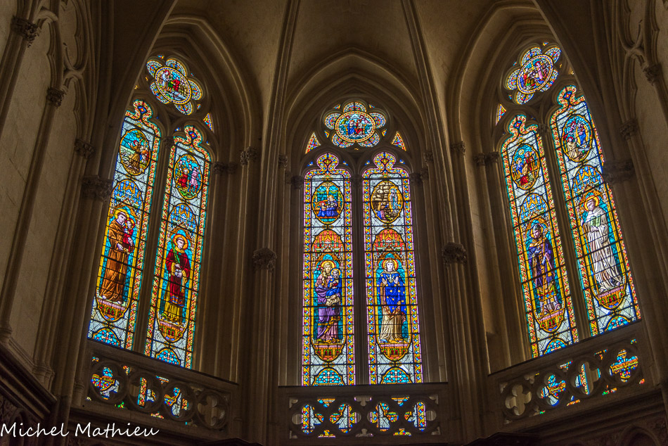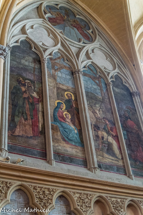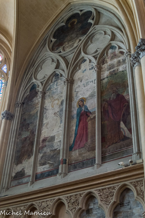 Les vitraux du XIXe siècle de Joseph Villiet représentent des scènes de la vie du Christ, de la Vierge et Saint Joseph avec des figures de l'ancien testament. En haut, la Vierge Marie. Au-dessus des personnages : naissance de Marie, présentation au temple, mariage de Marie et Joseph.