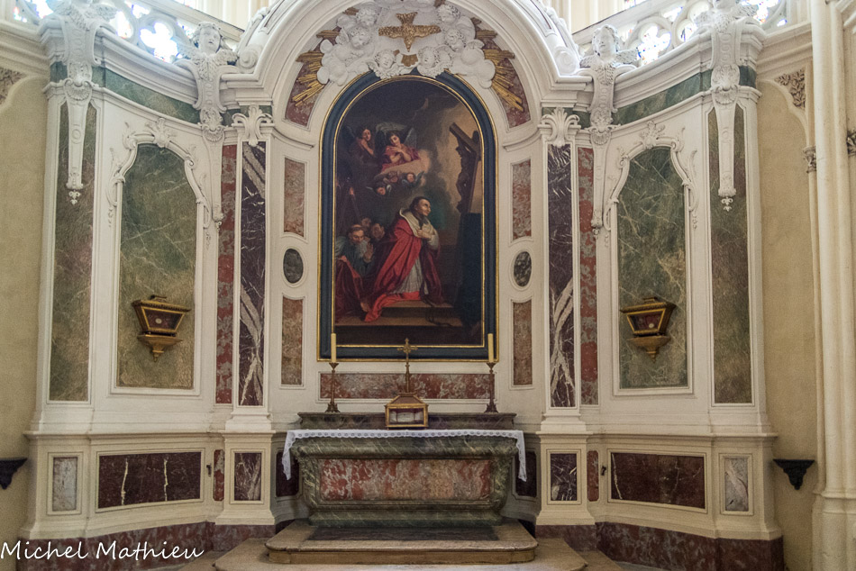 Au-dessus de l'autel, les figures peintes en 1868-1869 par Savinien Petit représentent la Vierge remettant à saint Simon Stock le scapulaire. Autour des grands saints de l'ordre du Carmel.
