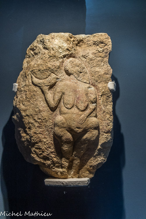 Grand Abri de Laussel, Marquay. Gravettien (- 25 000 ans environ). Ce bas-relief représente une femme de face tenant dans sa main droite une corne. Son visage n'a jamais été travaillé et la chevelure repose sur l'épaule gauche. Le bras droit est replié, comme pour la Vénus à tête quadrillée. Les seins sont tombants. La main, d'abord arrondie, a été reprise par gravure. Elle repose sur l'abdomen, situé sur la partie la plus convexe du bloc, renforçant son aspect volumineux. Les hanches sont très larges, tout comme les cuisses. Les pieds sont absents. Les contours sont très fortement creusés, ce qui accentue les jeux d'ombres et de lumières. Les proportions de cette figure sont surprenantes et le rapport tête/corps est inexact Les membres (notamment le bras gauche) sont raccourcis par rapport à l'abdomen et aux hanches. Tous ces caractères montrent que l'artiste a mis en valeur les marqueurs de la grossesse et cette femme a sûrement enfanté plusieurs fois. Les représentations féminines de Laussel peuvent participer à un culte ou à une mise en valeur de la fécondité, mais sans aucune certitude. La corne, probablement de bovidé, avec ses treize incisions a fait couler beaucoup d'encre : corne d'abondance, calendrier lunaire ou obstétrical, corne à boire, instrument de musique...
