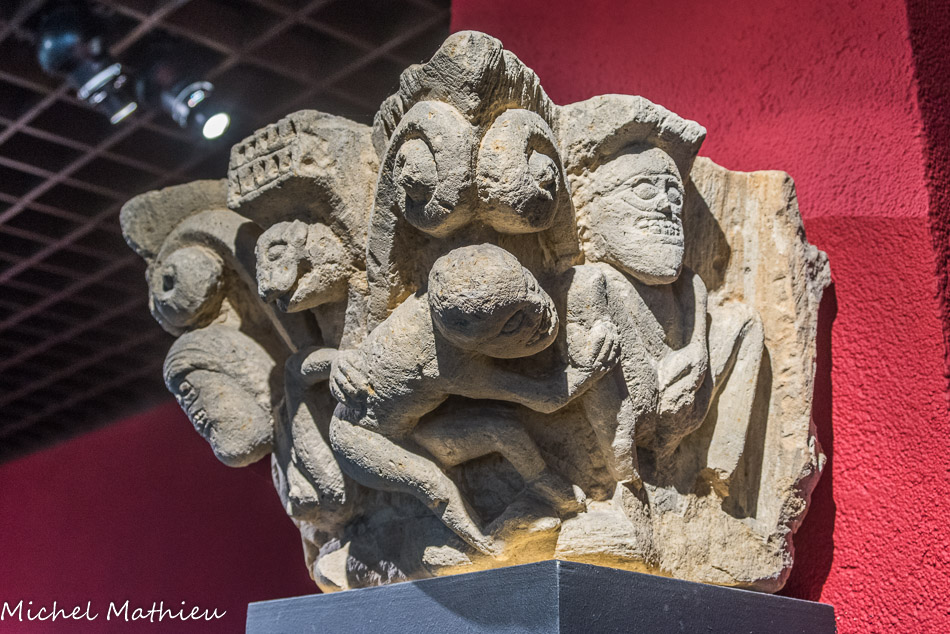 Chapiteau historié orné sur trois faces de trois êtres nus. Parmi les vices dénoncés par l’église à cette époque, la luxure est l’un des plus souvent représenté, avec l’avarice.