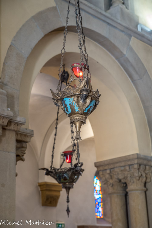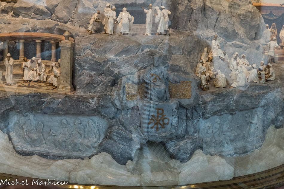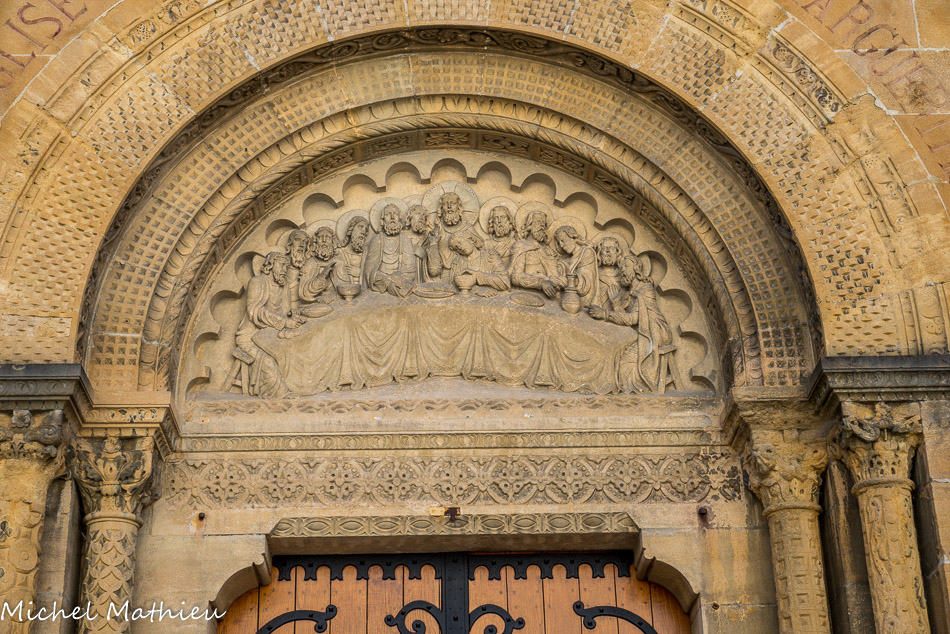 Au cœur du sanctuaire, la chapelle des Apparitions (XVIIe-XIXe siècles) Le tympan s'inspire de celui de Charlieu (Loire). Il représente la Cène au moment où Jésus bénit le pain devant ses disciples.