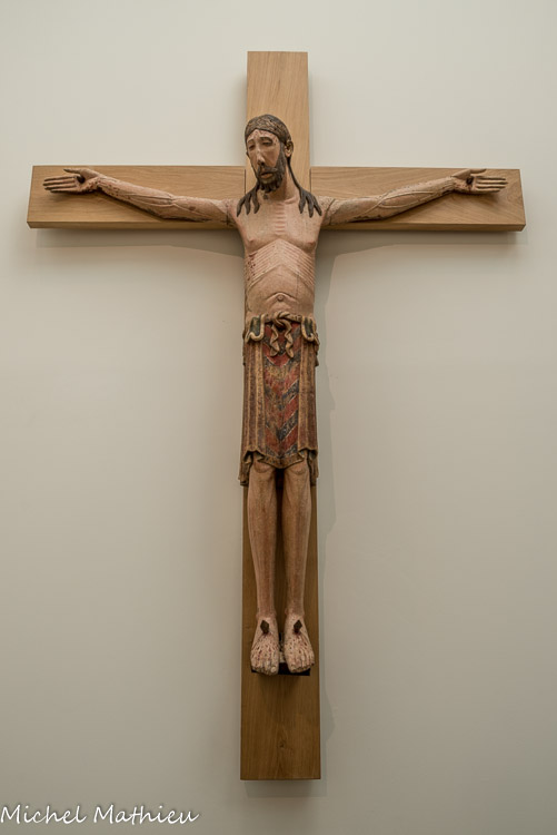 Christ au sourire. Cette pièce originale dans les collections françaises est un Christ de calvaire en terre cuite de la première moitié du 16e siècle. Les trous ménagés dans la partie supérieure permettaient l'insertion d'épines en bois pour figurer la couronne, dont on a retrouvé quelques fragments. L'expression sereine du visage étonne ainsi que la position penchée de la tête, invitant subtilement le visiteur à s'approcher de la sculpture.