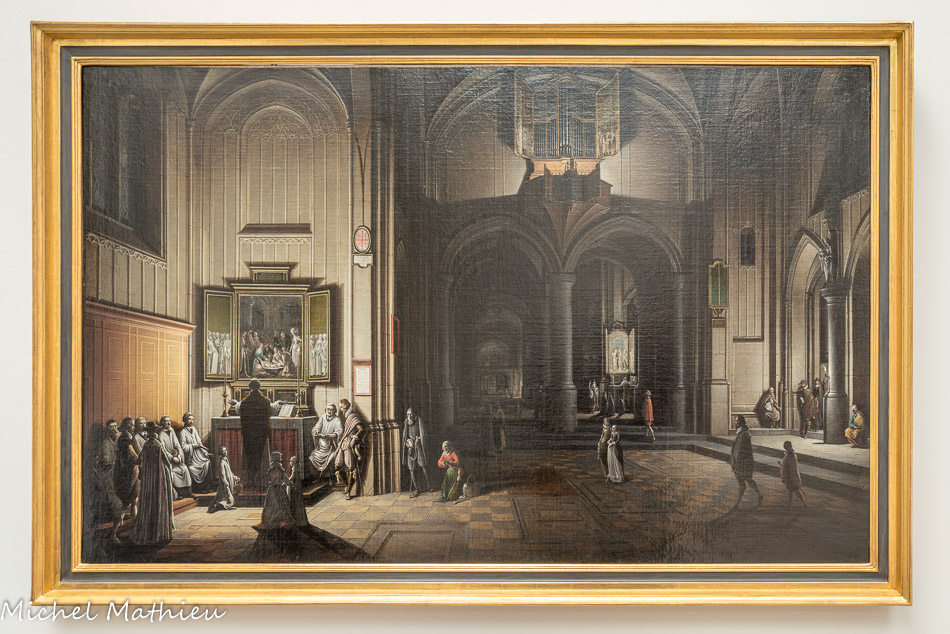 Intérieur d'église. Henri van Steinwick le Jeune (1580-1649). Signé et daté, 1623. Huile sur toile. La partie éclairée attire d'abord le regard vers le prêtre qui officie face à l'autel, pratique en vigueur jusqu'au concile Vatican II (1962-1965). L'atmosphère contrastée, entre espaces lumineux et zones d'ombres, témoigne de la virtuosité du peintre.