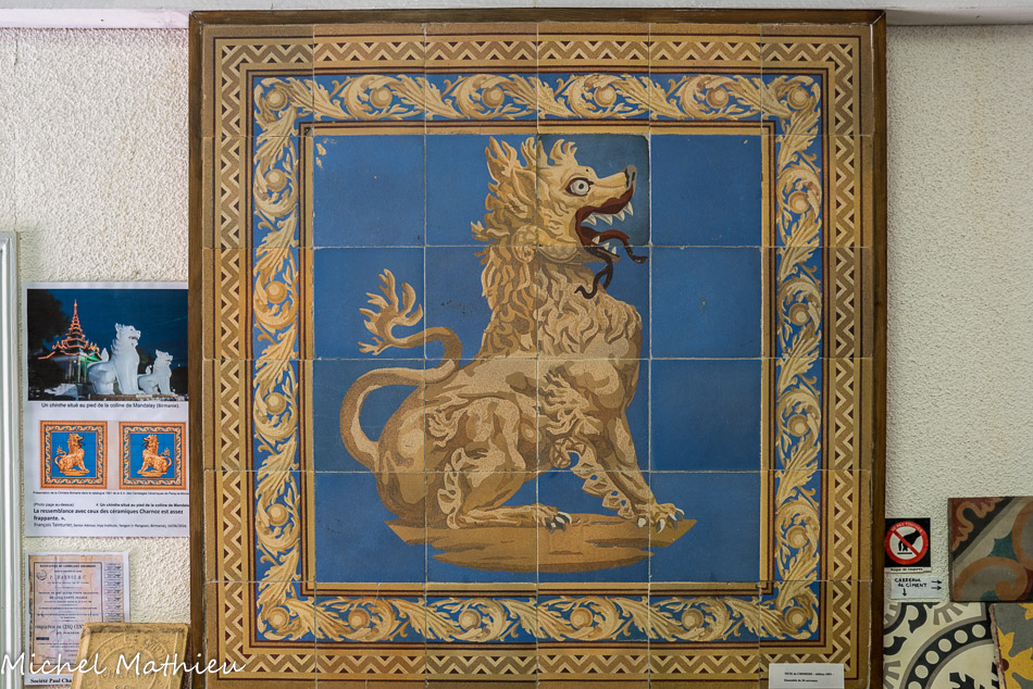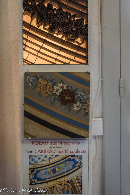 « Cette rosace fut créée pour l’Exposition Universelle de Paris en 1900 par Paul Chamoz lui-même, dont la signature figure sur les plans destinés à la fabrication ainsi que sur un dessin préparatoire du palier qui ornait l’entrée du Palais de la Céramique de cette exposition et qui reprend un motif similaire mais selon un plan en arc outrepassé.