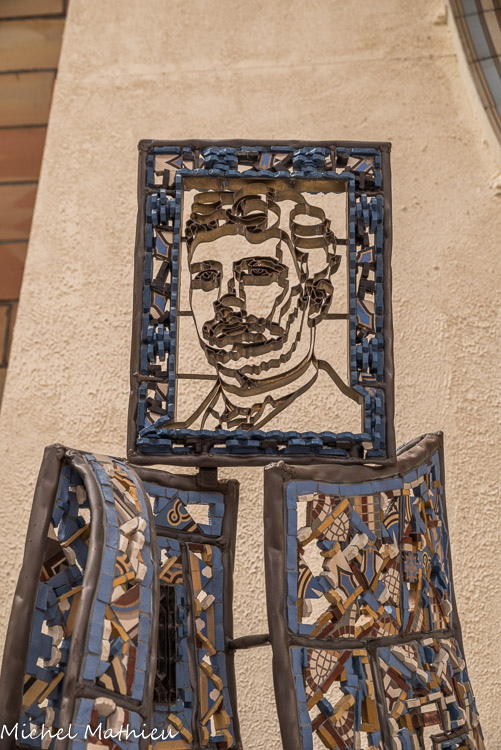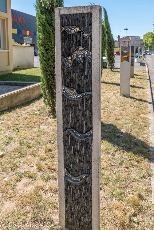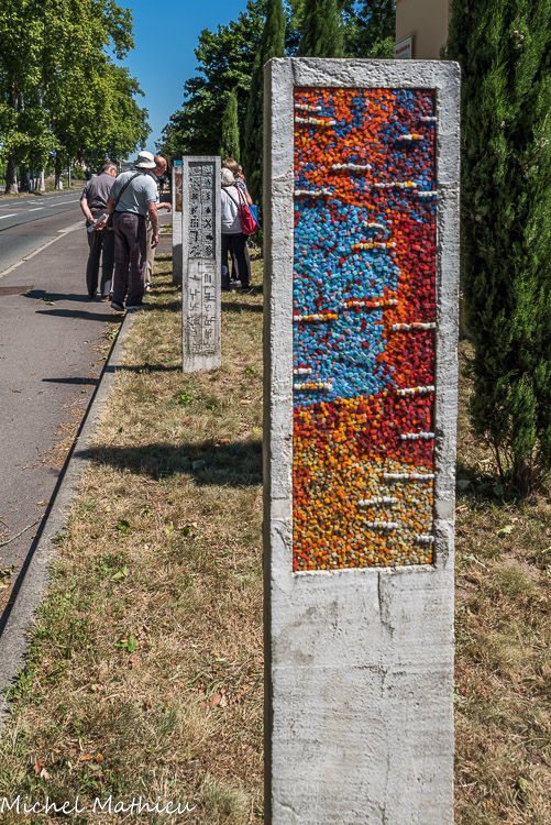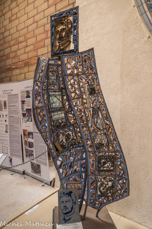 Le réseau en laiton du visage de Paul Cliamoz (réalisé par André Dessertine) a été imprimé dans une plaque d’argile par l’artiste Gérard Brand, avant la fixation définitive du réseau du visage dans la sculpture mosaïque ci-dessus.