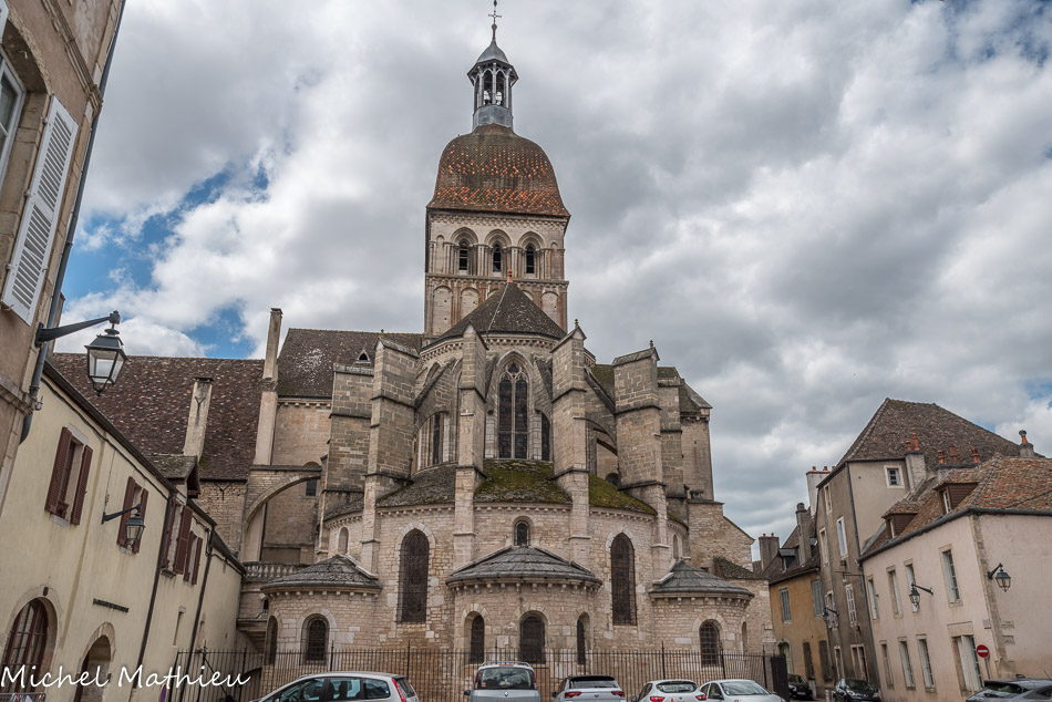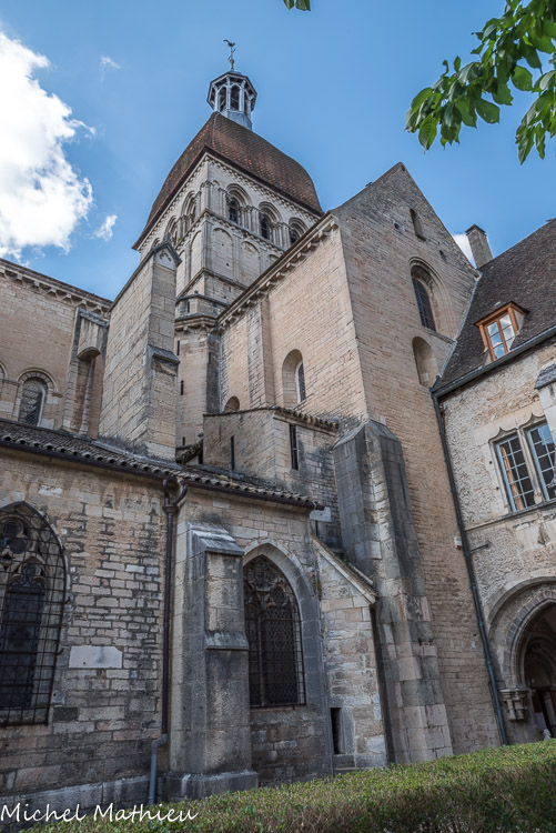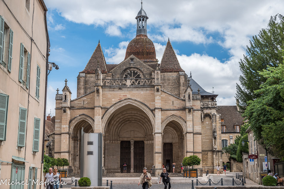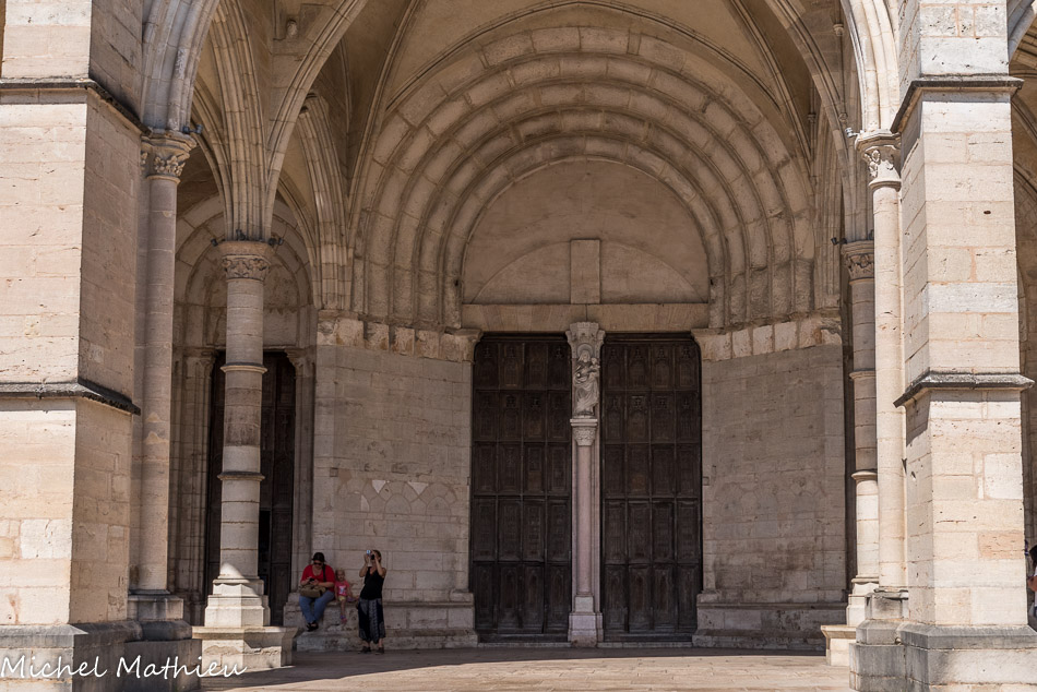 La façade est couronnée par un pignon avec une rosace et par deux clochers carrés inachevés du 13e siècle. Elle est précédée d’un porche ouvert construit durant les années 1330-1340 dans le style gothique bourguignon.