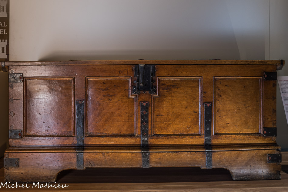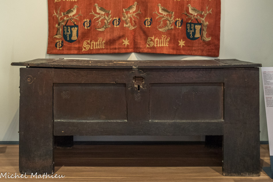 Coffre exceptionnel ayant appartenu à Guigone de Salins, comme l’indiquent la tour et la clef pyrogravées au fer à trois reprises sur la façade. Ce coffre est le quatrième d’une série de coffres identiques car chaque élément qui le compose est marqué (dans les parties cachées) du chiffre romain quatre sous forme de quatre traits parallèles.
