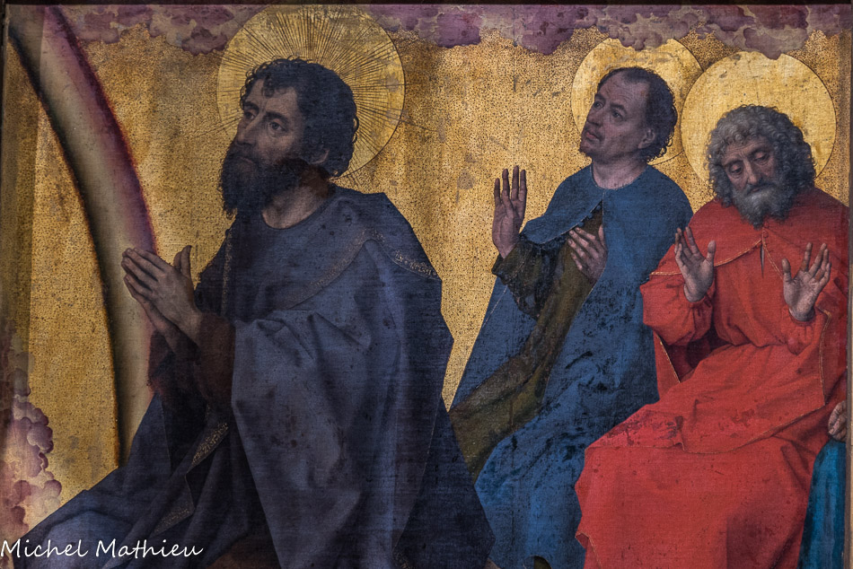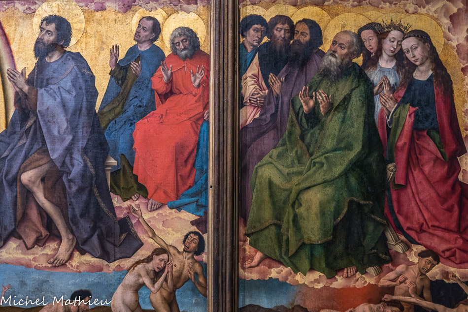 Polyptyque. Le pape Eugène IV qui a signé la bulle autorisant la fondation de l’Hôtel-Dieu, le duc de Bourgogne Philippe le Bon, l’évêque Jean Rolin, fils du fondateur, et sous les traits de l’homme chauve, peut-être l’artiste lui-même.