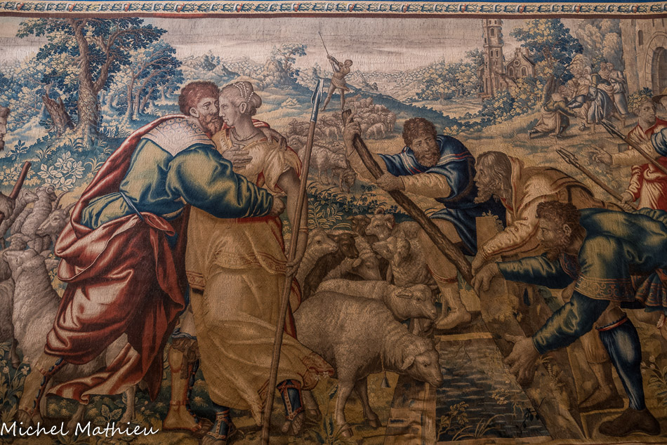 Martin Reymbouts, Bruxelles, début 17e siècle. D'après la Genèse, premier livre de la Bible, Jacob est le fils cadet d'Isaac et de Rébecca et le petit-fils d’Abraham. Il est le père de douze fils qui seront les fondateurs légendaires des douze tribus d'Israël. C'est un des patriarches de la Bible. l aurait vécu entre le XVIIe et le XVe siècle avant JC. Son histoire est racontée dans le livre de la Genèse. Jacob vient de l’hébreux Ya’aqov qui signifie « Dieu protège » et a donné le prénom Jacques.