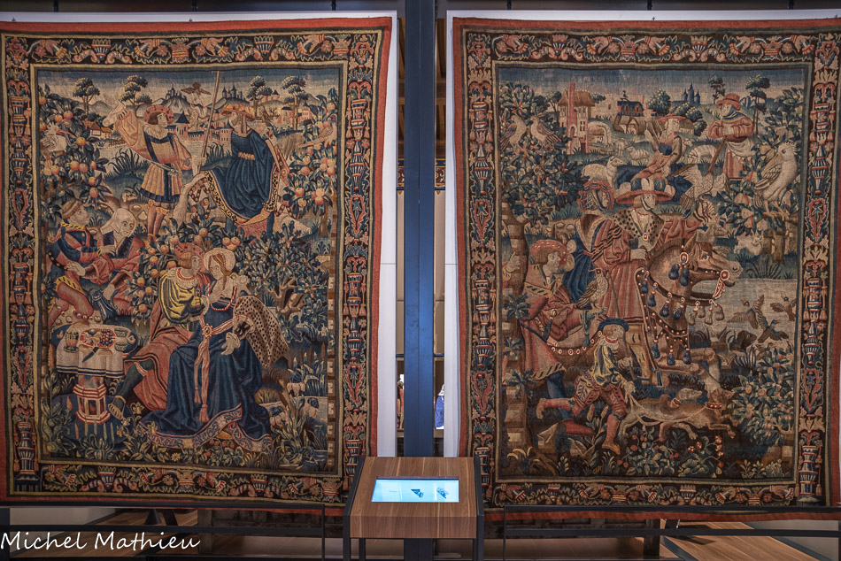 Cette tenture porte dans la lisière de ses pièces la marque de Martin Reymbouts, tapissier bruxellois du début du 17e siècle. Il réalisa une autre tenture similaire conservée en Autriche. Ce thème eut un grand succès car il associe loisirs de la chasse, scène amoureuse, rêve paradisiaque et bénédiction religieuse. Cette tenture est d’une belle qualité de dessin et de tissage (8 fils au cm). Les différentes pièces de cette, tenture sont présentées en alternance afin de ne pas les exposer en permanence à la lumière qui est cause de dégradations.