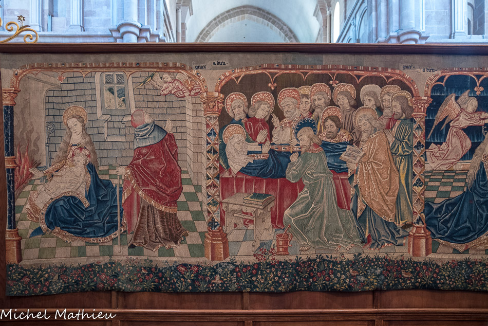 Tapisseries de la Vierge, dites "à mille fleurs", tissées en soie et laine sur 19 panneaux. le couronnement de Marie, puis un portrait et les armoiries du donateur.