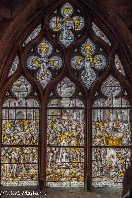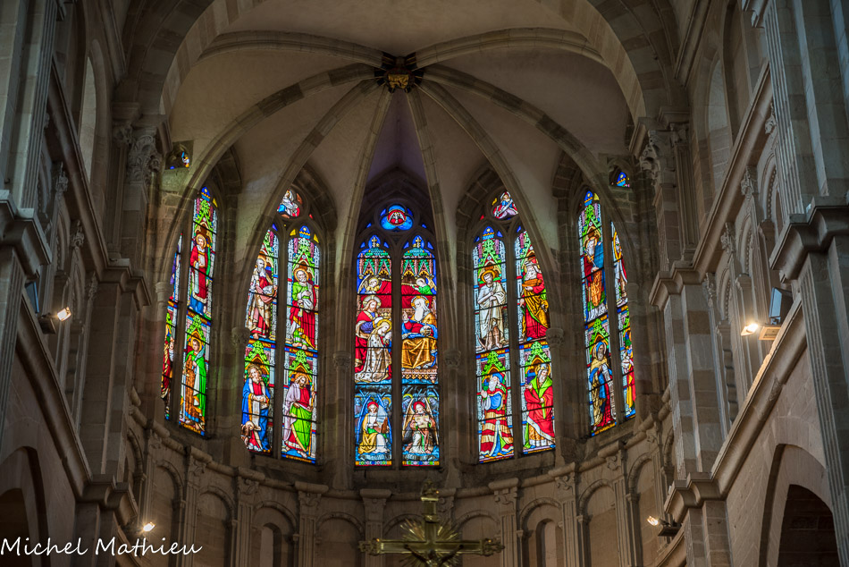 Le cloître et la salle capitulaire sont reconstruits au 13e siècle par le chapitre, comptant trente chanoines à cette époque. En 1265 eut lieu la translation des reliques de saint Flocel et de saint Herné de l’ancienne église Saint-Flocel à Notre-Dame. En 1273, l’église est incendiée par le feu. Elle est restaurée dans le goût gothique et renforcée par des arcs-boutants à la fin du 13e siècle et au début du 14e siècle. A la fin du Moyen-Age, l’église est complétée par un nouveau porche gothique et par des séries de chapelles latérales. Les cardinaux Rolin dotent l’église d’œuvres d’art de style flamboyant et Renaissance de première importance. Un nouvel incendie en 1575 détruisit la flèche du clocher qui est reconstruite par Hugues Sambin.