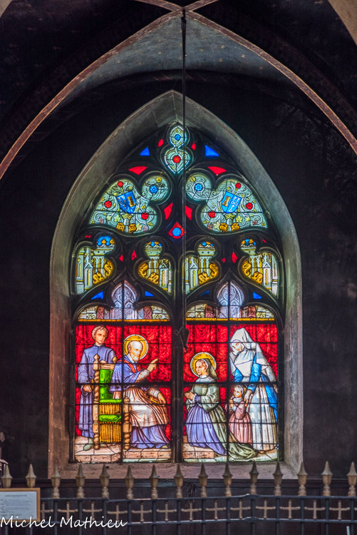 Le décor sculpté est emprunté à l’architecture. Il reprend les modèles des baies des édifices de la fin de l’époque gothique. La succession de rosaces enserrées dans des arcs en accolade, est interrompu par une fleur de lys sculpté sous la serrure. Ce coffre est monté sur un socle qui a été reconstitué d’après les modèles conservés à l’Hôtel-Dieu. Les planches de la caisse sont assemblées en queues d’aronde dans les angles.