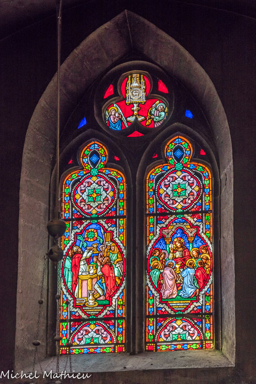 Saint-Pierre proteste de sa fidélité à son maître. Saint-Pierre est crucifié la tête en bas. Saint-Pierre sortant de Rome rencontre Jésus portant sa croix. Vitrail de Didron, 1898.