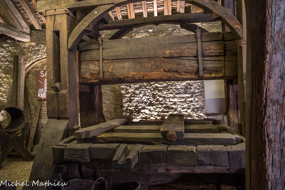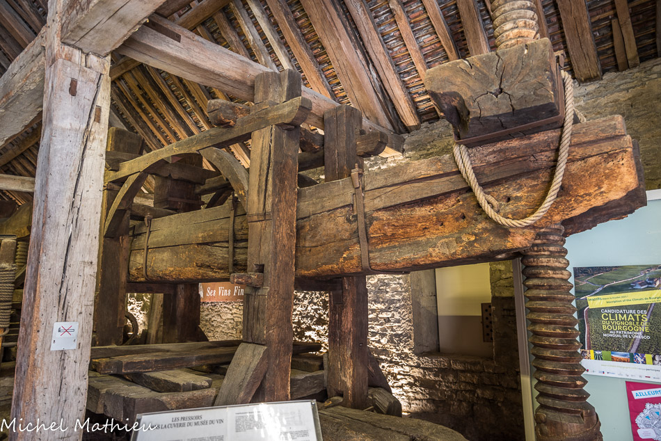 Les pressoirs dans la cuverie du musée du vin. Dans l'Antiquité égyptienne, grecque et romaine, on employa successivement la technique de la torsion d'une grande pièce d'étoffe enfermant le raisin, puis des bâtis serrant la vendange à l'aide de coins enfoncés au maillet. Au Moyen-Age, des machines, dont la pression s'obtenait par un cabestan mû par un jeu de leviers furent utilisés.