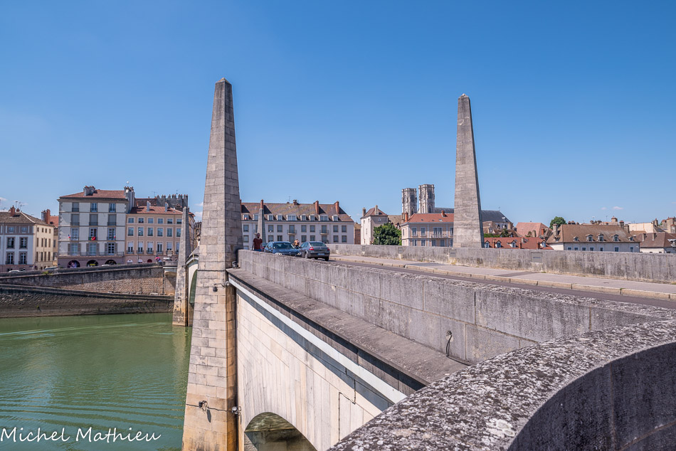 Au XVIIe siècle, le pont médiéval, agrémenté de portes, pont-levis et guérites, fut une première fois réaménagé avant d'être de nouveau reconstruit en 1789 par Emiland Gauthey. Gauthey scandent les piles du pont de 8 obélisques, témoignant de la fascination du temps pour l'architecture égyptienne. Aujourd'hui, les quatre obélisques sont en béton armé.