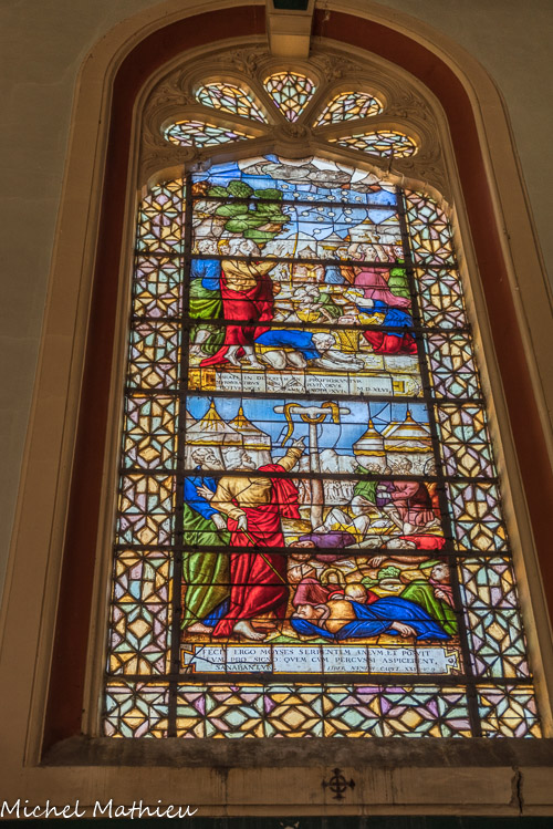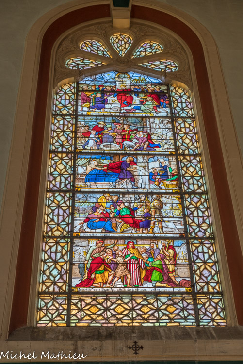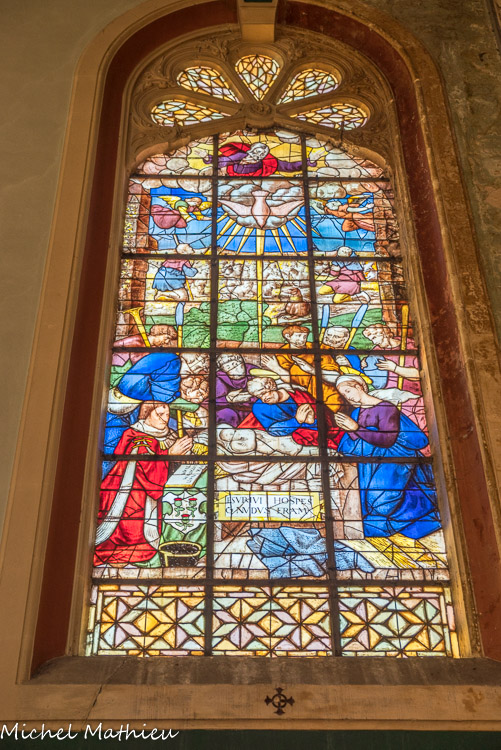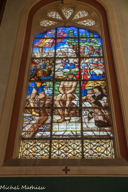 La chapelle du XIXe est ornée de vitraux du XVIe siècle qui proviennent de la première salle de malades édifiée à la Renaissance. Ces vitraux sont entourés d'entrelacs. Chacun raconte une histoire, tirée de la Bible, plus précisant des éléments de l'Ancien et du Nouveau Testament. La transfiguration.