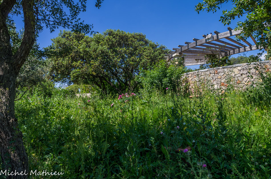 Depuis ce belvédère le regard, canalisé par la pergola, glisse sur le jardin, le bâtiment puis vers l'étang de Thau.