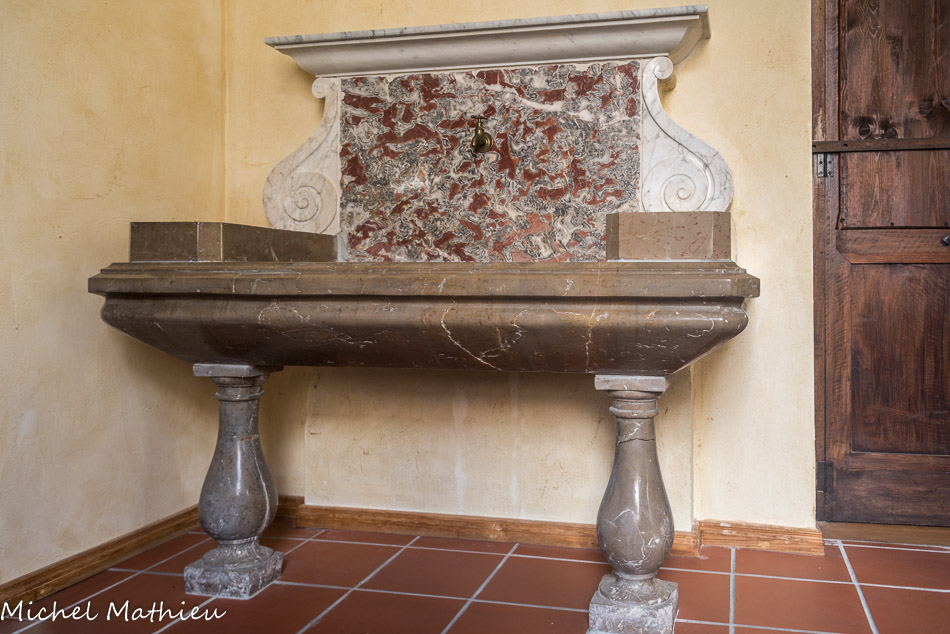 L’apothicairerie de l’Hôpital de Lodève. Dans le laboratoire (ou cuisine) de l'hôpital on trouvait cet évier en marbre de Caunes en Minervois, avec comme pieds deux balustres, et