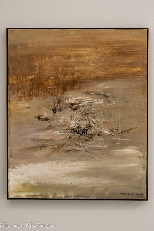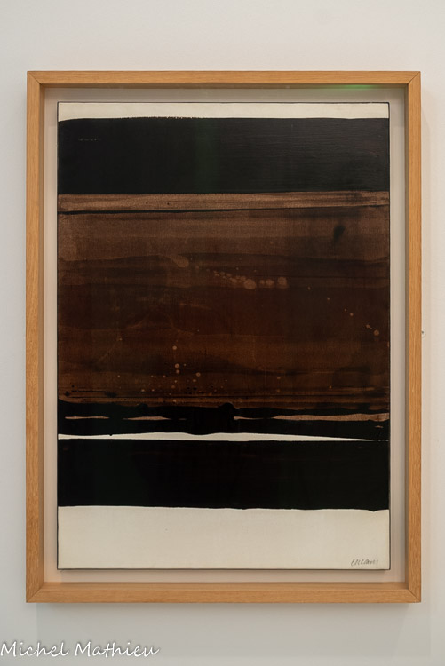 Montpellier, musée Fabre, dépôt de l’artiste, 2007. Proche de ses œuvres sur papier, cette œuvre sur toile témoigne de l’utilisation réitérée, sur plusieurs décennies, du brou de noix. Délaissée depuis la fin des années 1950, cette technique est ici alliée à une émulsion acrylo-vinylique, offrant plus de stabilité et de résistance à la matière. Un grand raclage vertical laisse apparaître, par effet de transparence, la surface lumineuse de la toile, que l’on devine sous une fine nappe brune, tandis que le haut de la toile, plus sombre, supporte une lourde couche de peinture, qui reprend la structure du châssis et se répand sur ses bords.