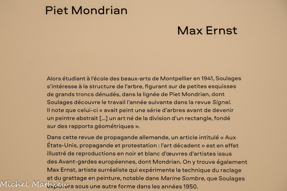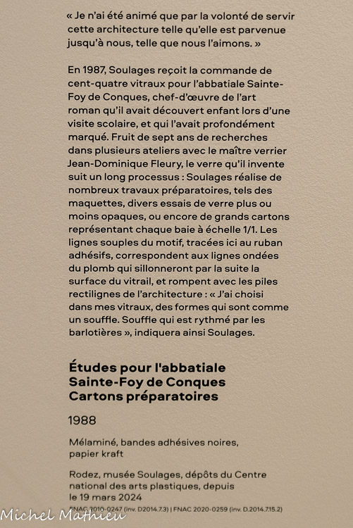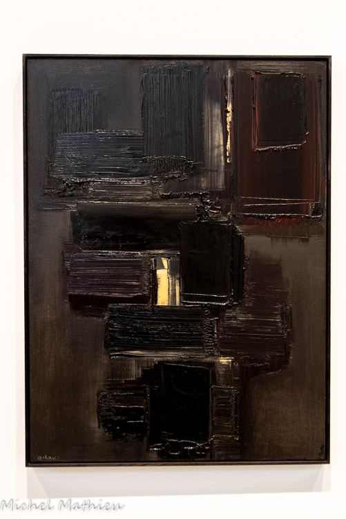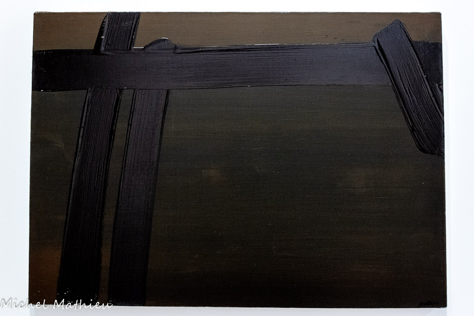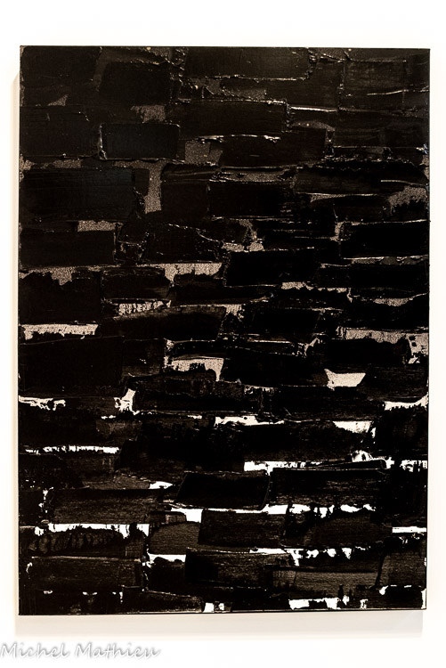 Paris, Centre Pompidou, Musée national d’art moderne / Centre de création industrielle. Don de l’artiste en signe d’amitié et d'estime pour Alfred Pacquement, 2013. En séjour à Montpellier durant l’été 1948, Soulages réalise quatre peintures au noir de goudron qu’il étale sur des plaques de verre brisé, à l’aide d’une « queue-de-morue » de peintre en bâtiment. Le peintre en parle comme des réminiscences d’un souvenir, lors de son arrivée à Paris en 1946, ému qu’il était devant les verrières de la gare de Lyon, endommagées pendant la guerre et rapiécées avec du goudron. Dans ces œuvres, dont trois ont été conservées, la matière épaisse, fréquemment employée pour imperméabiliser les toitures, est diluée au white spirit. Par la densité de la matière, ces œuvres préfigurent les toiles monopigmentaires de la finde sa carrière et par le support, les vitraux de l’église abbatiale Sainte-Foy de Conques.
