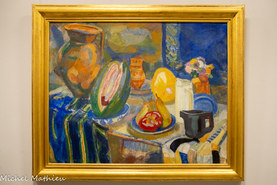 Robert et Sonia Delaunay se réfugient au Portugal durant la Première Guerre mondiale. Dans cette nature morte qui doit beaucoup à Paul Cézanne, le peintre poursuit ses recherches autour de la couleur qui tient lieu de dessin, de volume et de perspective.