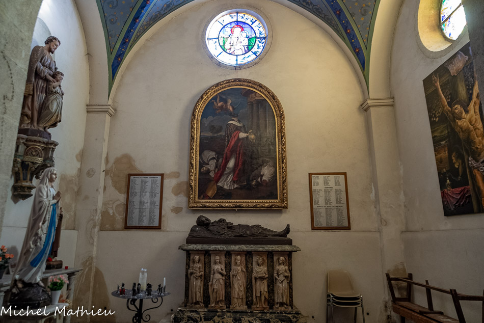 Le «monument aux morts», un gisant en mémoire du soldat inconnu. Encadrés par deux anges, sainte Jeanne d'Arc, saint Denys, et saint Louis.