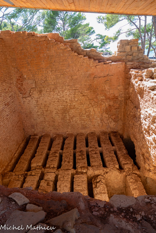 Un impluvium. La pars urbana, zone privée de la villa, n’a pas été construite dans la partie basse du terrain par hasard mais pour profiter de deux avantages: la proximité de la mer et l’utilisation de la gravité pour obtenir de l’eau courante captée à une altitude de plus ou moins 80 m en amont (La Nartette) et stockée dans un grand réservoir établi sur la hauteur proche de la villa.
