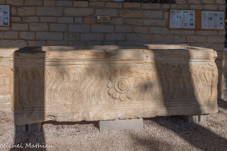 Ce beau sarcophage monolithe décoré de strigiles est du IIe-IIIe siècle, et fut découvert en 1830 sur le site Il est en calcaire local finement travaillé, et pèse 2600 kg.