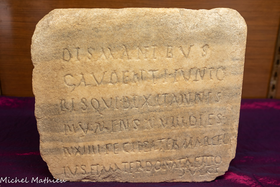 Epigraphe latine : Aux dieux manes, Gautentius Junior qui a vécu 5 ans, 8 mois et 14 jours. Fait par le père Marcellus et la mère Donata, à leur fils chérei.