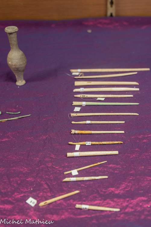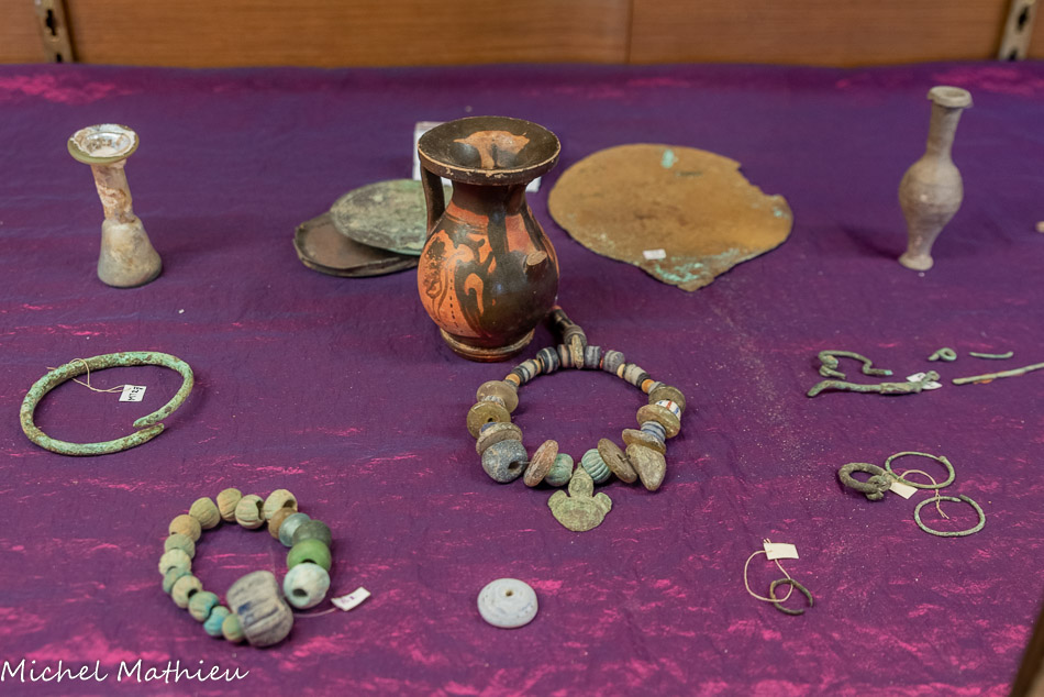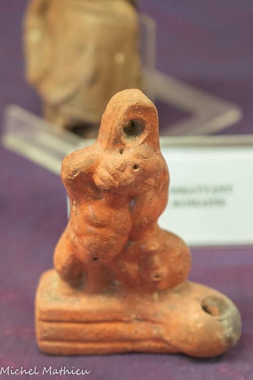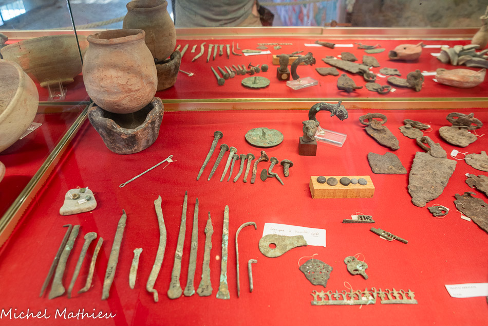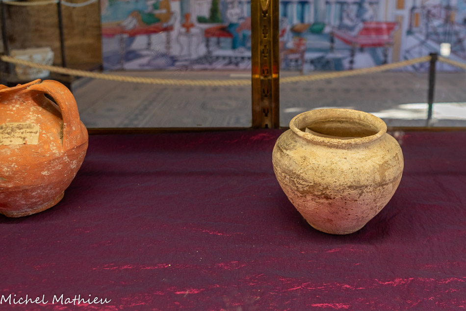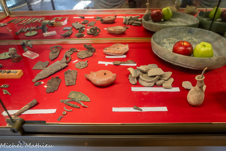 Accrochée au mur de gauche, une collection d’amphores à vin, donc italiques à anses longues et venant de la région de Pompéi. Leur fond pointu permettait de les caler dans les bateaux de transport avec du sable et des branchages. Les deux premières à gauche : Amphore gréco-italique de type Lyding-will e datation -175/-100. Puis trois Amphores de type Dressel 1A datation : -135/-50. Une Amphore de type Dressel 1 B datation -100/-1. Deux Amphores de type Dressel 1A datation : -135/-50. La dernière, Amphore de type Dressel 2-4 datation : -30/150.