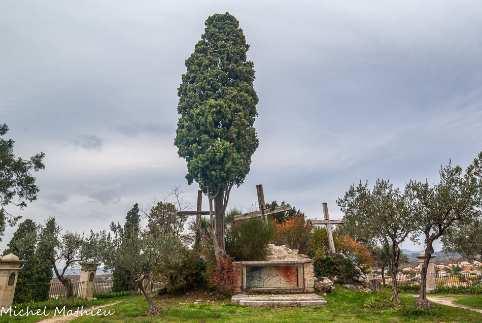 Malaucène. Le calvaire de Malaucène. Cette colline de safre, qui surmonte le village et lui a donné son nom, est plantée de trois croix faisant mémoire de la crucifixion du Christ, entre les deux larrons, sur la butte du Golgotha (mot hébreu qui signifié crâne) à Jérusalem. Dans le monde romain, le supplice de la croix est le sort réservé aux esclaves et aux rebelles. La tradition religieuse veut que le Christ ait été crucifié au-dessus du crâne (du latin calvaria) d'Adam, le premier homme, rachetant ainsi par sa mort le péché originel.