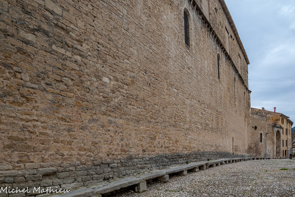Malaucène. En 1579, contre la menace des Huguenots, le mur de la face sud est surélevé entre les contreforts pour supporter un chemin de ronde avec merlons et crénaux. Six renforcements, que l’on pourrait prendre pour des fenêtres obturées, sont en réalité des contreforts enchâssés dans les murs.