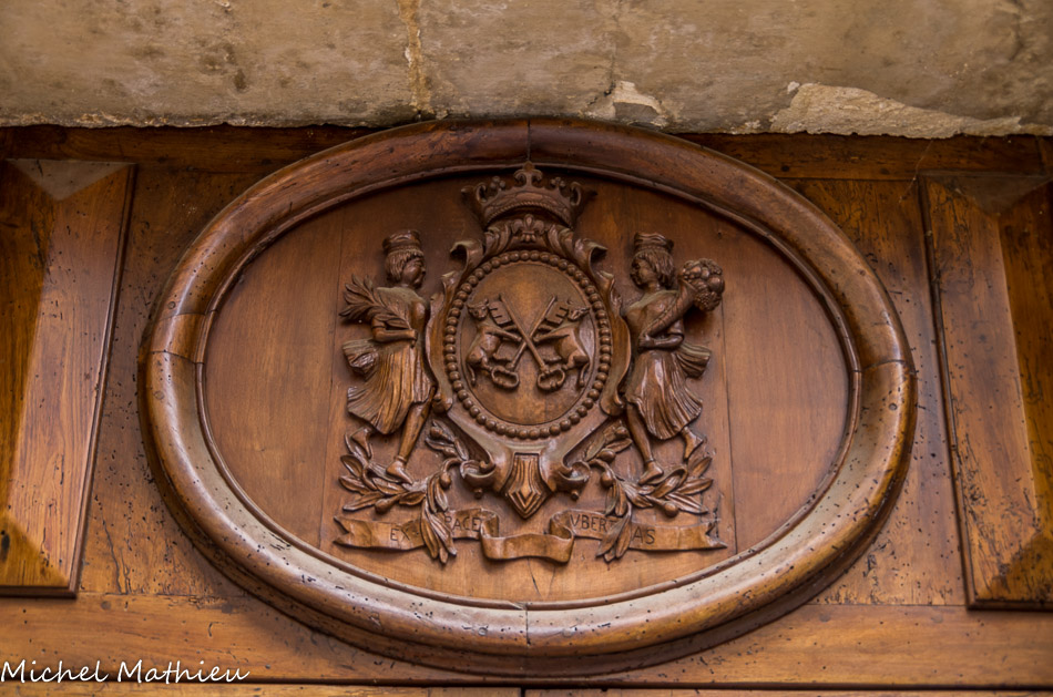 Malaucène. L'imposte de la belle porte d'entrée comprend les armes de la ville. Les deux clefs croisées marquent l'appartenance du village au territoire papal. Les deux veaux affrontés sont signe de richesse, comme le dit la devise «Est pave ubertas» (de la paix naît l'abondance). Plus tard furent ajoutées les deux nymphes. Cette porte a été rénovée en 1995 par un artisan malaucénien.